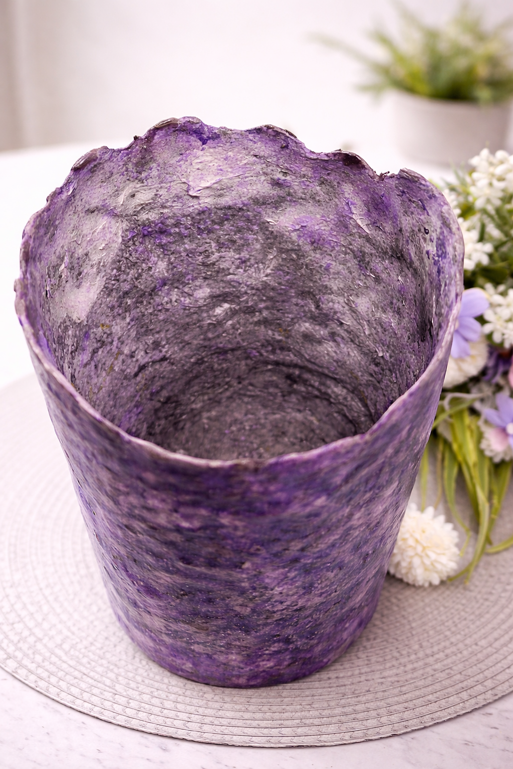 Gefertigt aus Pappmaché und veredelt mit organischen Acrylfarben sowie einer schützenden Lackierung, überzeugt die Vase mit ihrer besonderen Struktur und ihrer hochwertigen Ausstrahlung. Die Oberfläche ist wasserabweisend und kann vorsichtig mit einem feuchten Schwamm gereinigt werden.